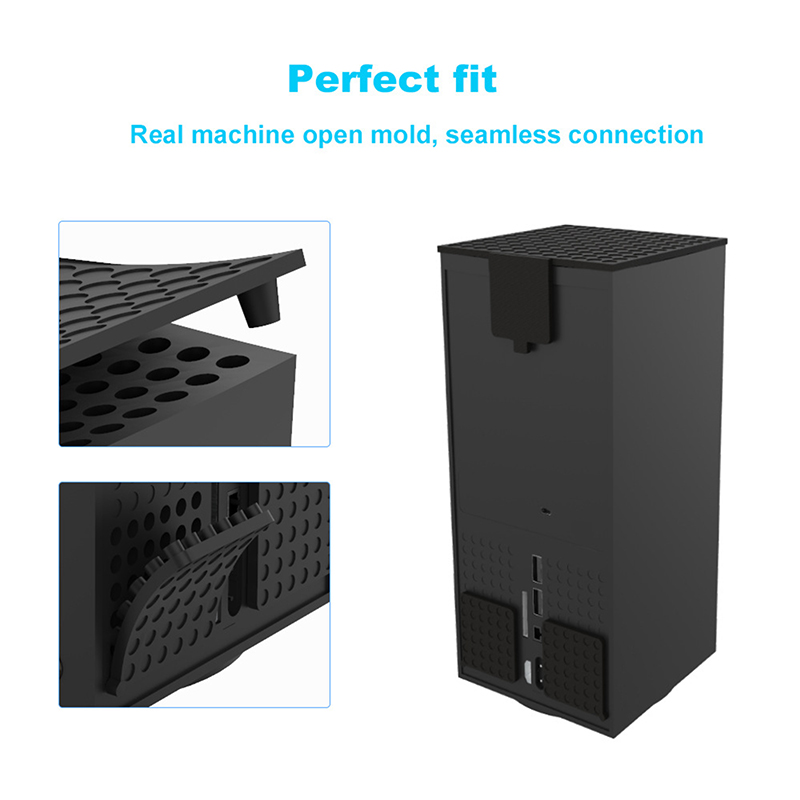 - Dammskydd speciellt utformat för Xbox Series X-konsolen för att förhindra att damm och vattenånga tränger in i USB-porten, HDMI-porten och ventilationsöppningarna