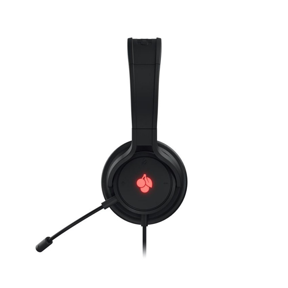 Högkvalitativa material och minimalistisk design kompletterar hela paketet. Röda upplysta CHERRY-logotyper sätter pricken över i:et till den eleganta looken och sätter en slående ton. Headsetet fälls ihop för att passa i vilken ficka som helst - perfekt för mobilt arbete eller täta byten av plats.