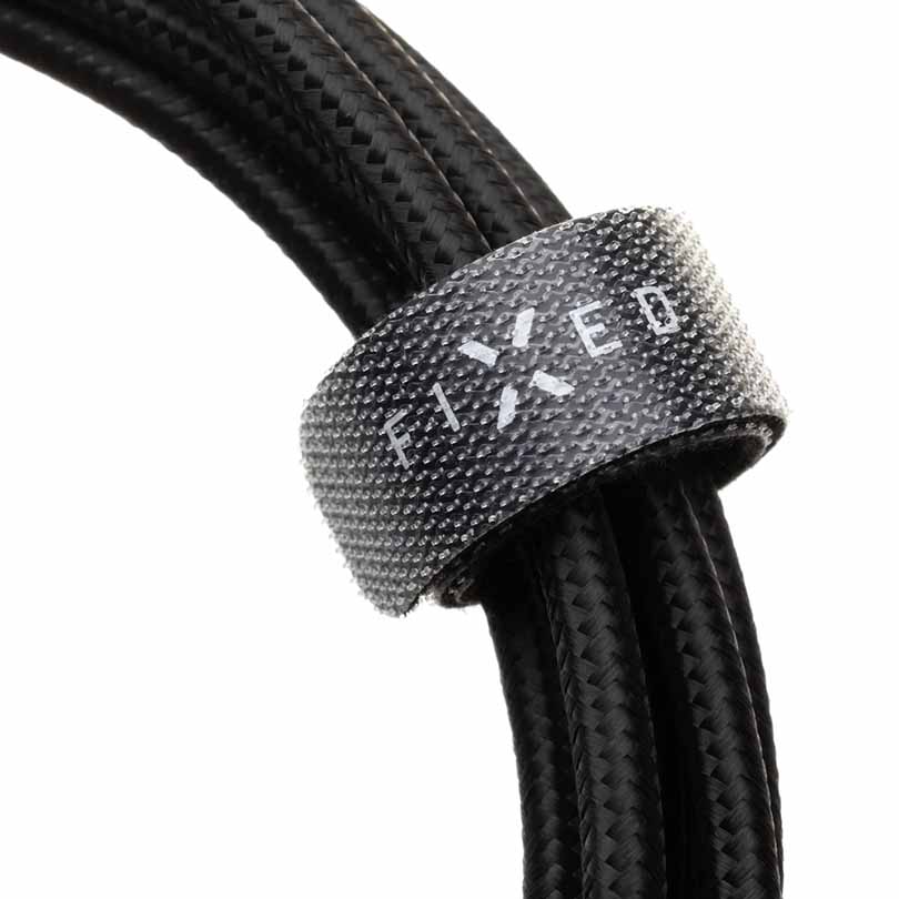 FIXED premiumkabel utformad med dubbelsidiga USB-C-kontakter och en extra tålig skyddsfläta som löper längs hela kabeln.