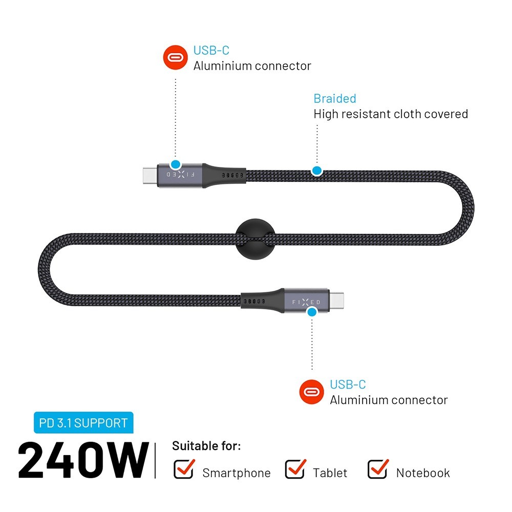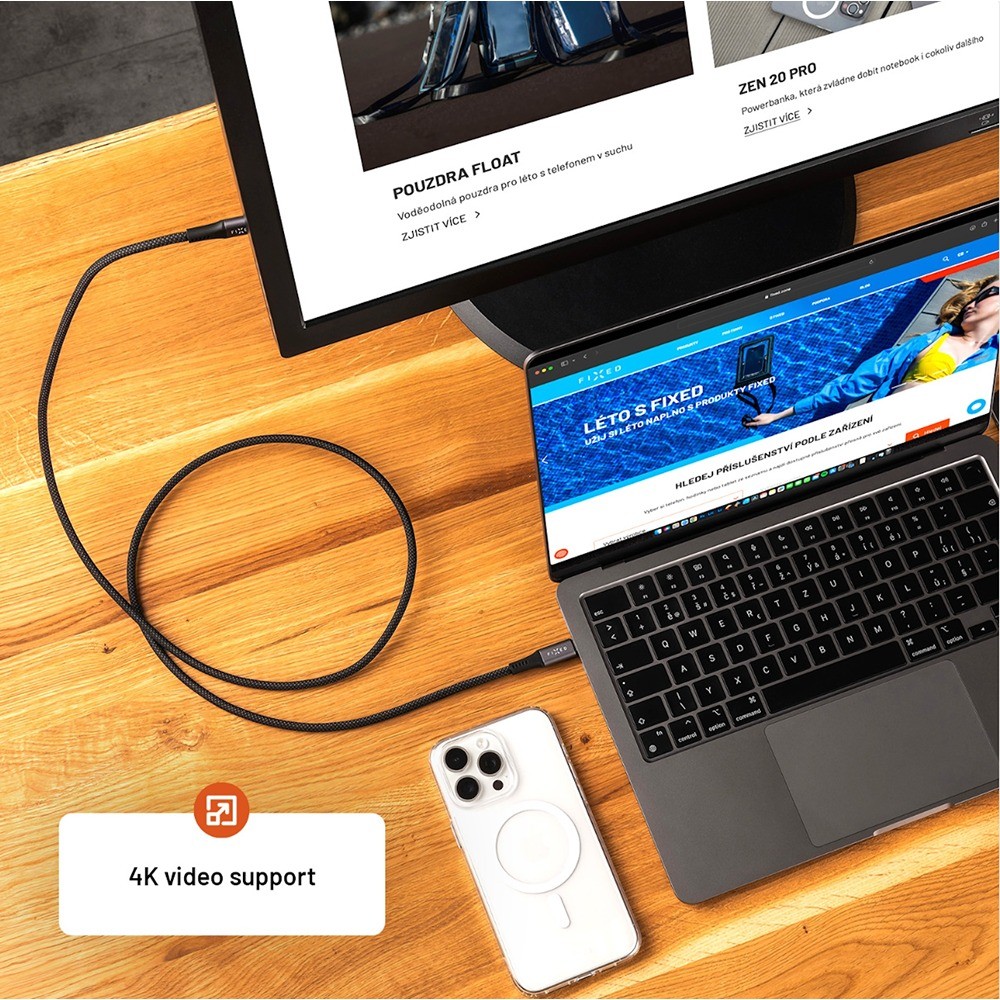 FIXED multimediakabel är byggd för dig som kräver snabb dataöverföring, kraftfull laddning upp till 240 W och videouppspelning i 4K – allt i en och samma kabel. Tack vare USB-C-kontakter i båda ändar kan du enkelt spegla eller strömma video i 4K-upplösning vid 60 Hz från din telefon, surfplatta eller MacBook till valfri skärm eller TV utrustad med USB-C-ingång. Var du än befinner dig får du en bildkvalitet i toppklass.