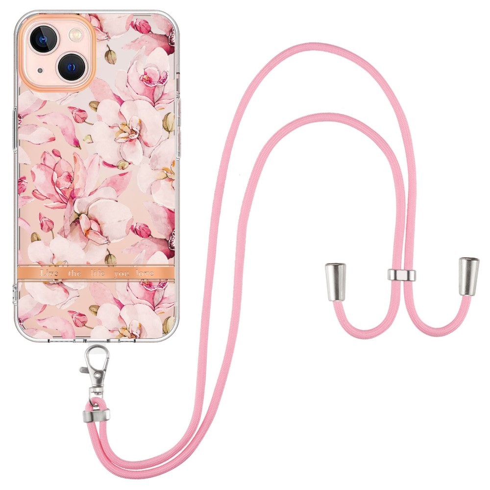 iPhone 15 Plus Skal Blommönster med Strap Rosa Gardenia