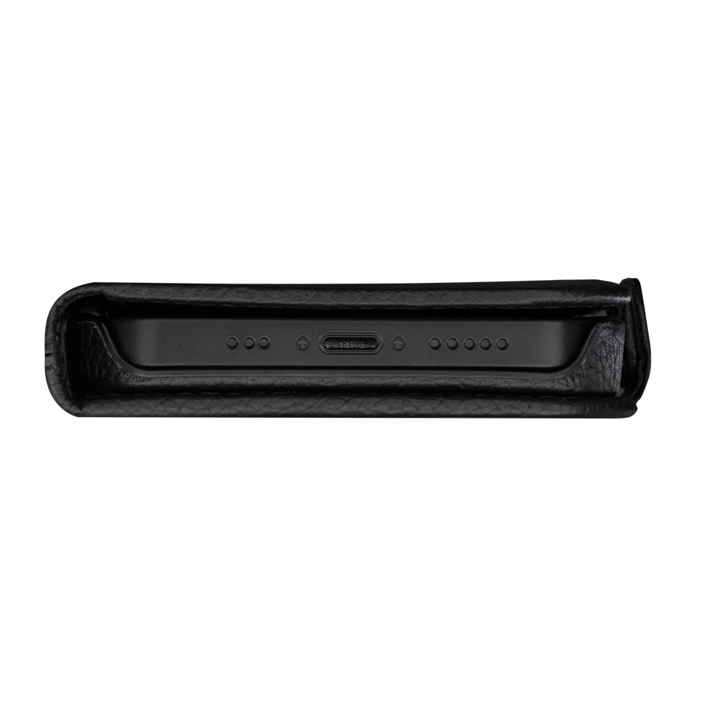 Mobilskyddet är handgjort i fullnarvsläder och har en magnetisk sidostängning. Det är även Trådlös laddning-kompatibel.