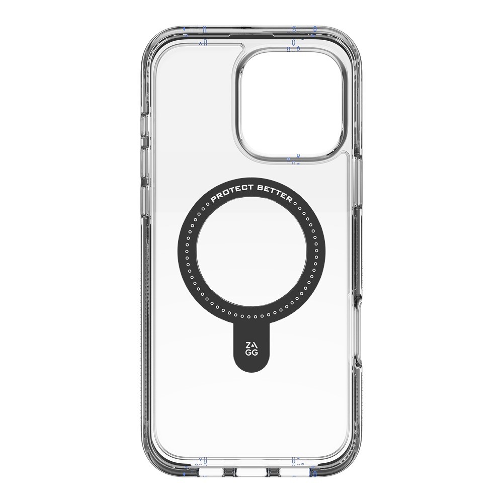 ZAGG iPhone 16 Pro Max Skal Santa Cruz Snap Ring Stand Svart är ett svart och genomskinligt mobilskal till iPhone 16 Pro Max.