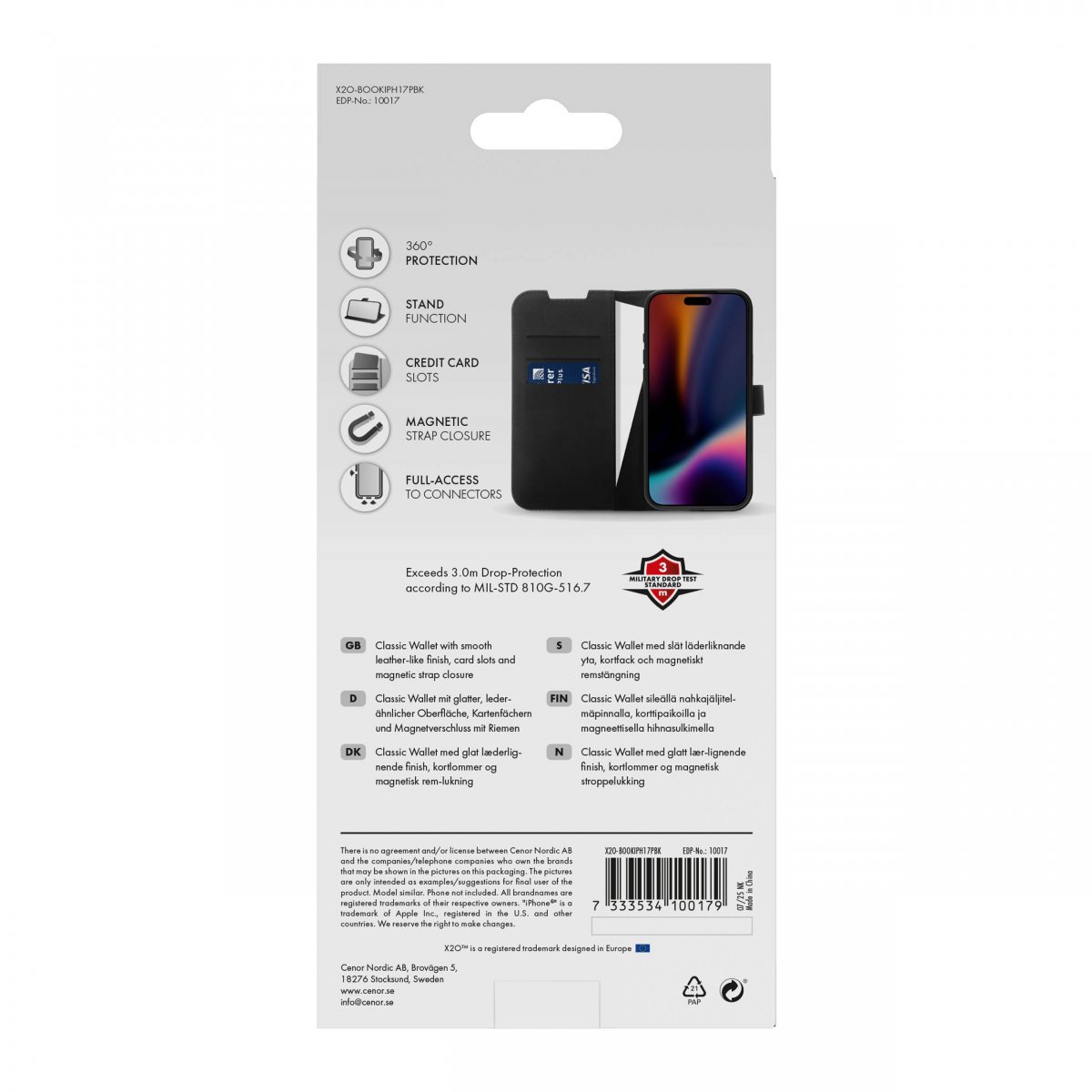 Skyddsfodralet har Kortfack och en magnetisk stängning som håller locket på plats. Stativfunktion gör det smidigt att ställa upp mobilen i liggande läge.