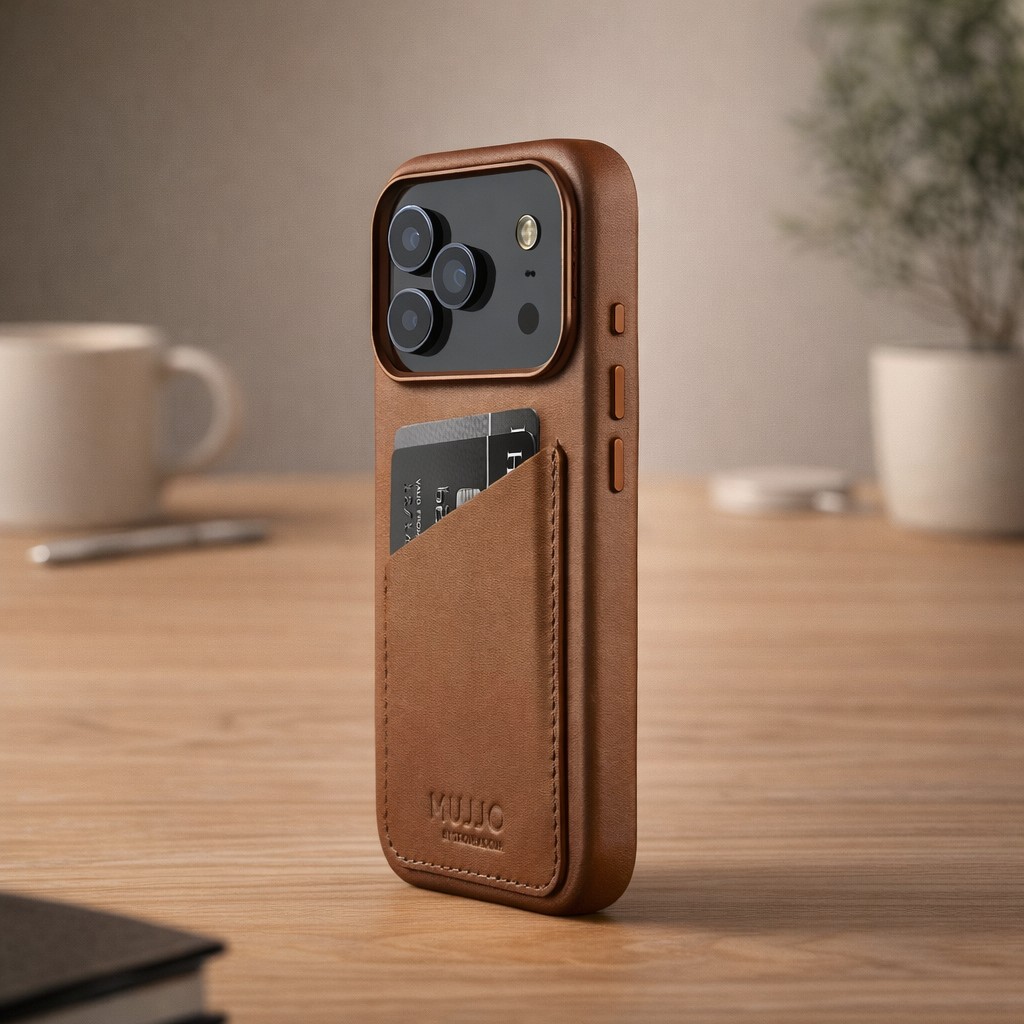 Mujjo iPhone 17 Pro Skal Full Leather Wallet Case MagSafe Tan är ett brunt telefonskal till Apple iPhone 17 Pro.