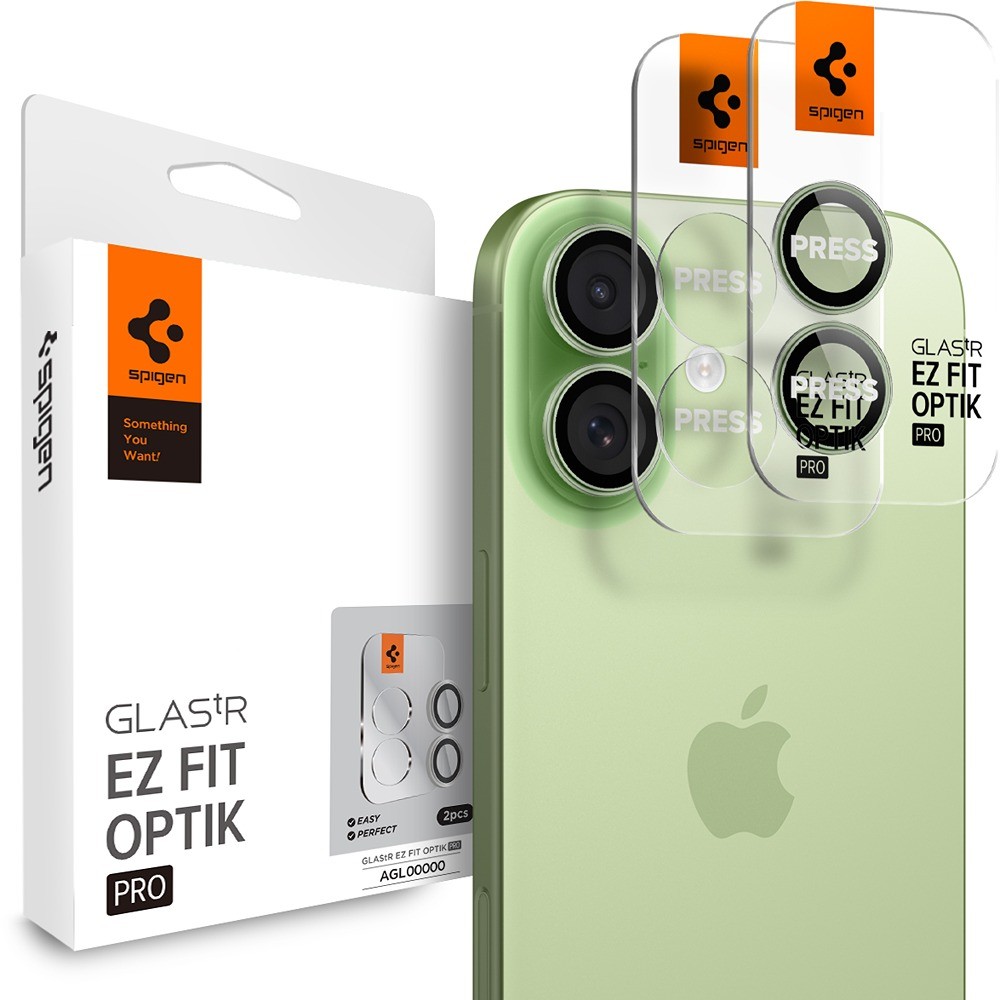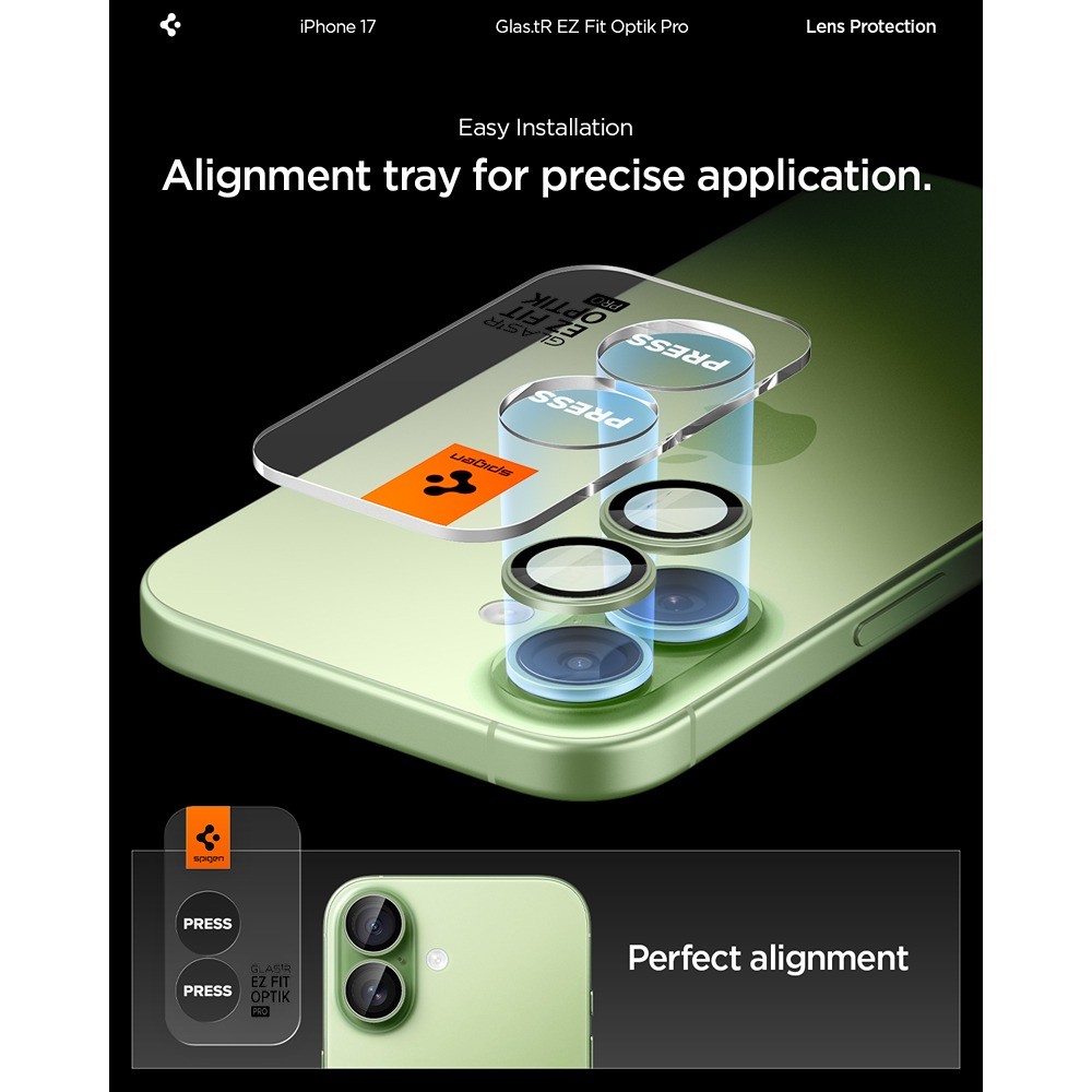 Spigen iPhone 17 Kameraskydd GLAS.tR EZ Fit Optik Pro 2-pack Grön är ett grönt och genomskinligt kameraskydd till Apple iPhone 17.