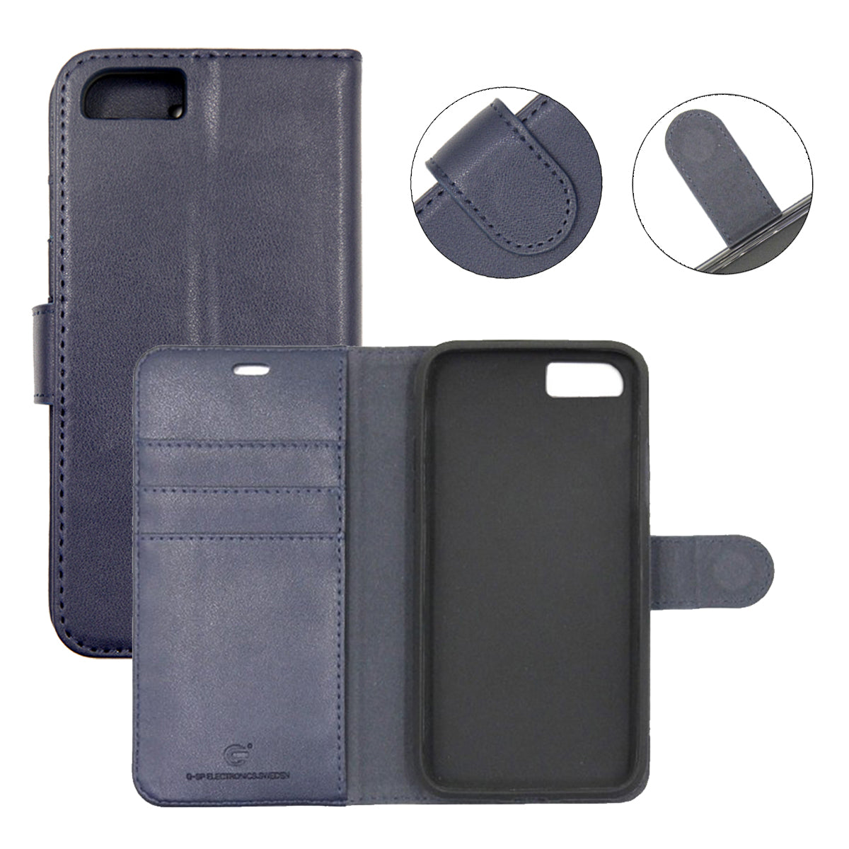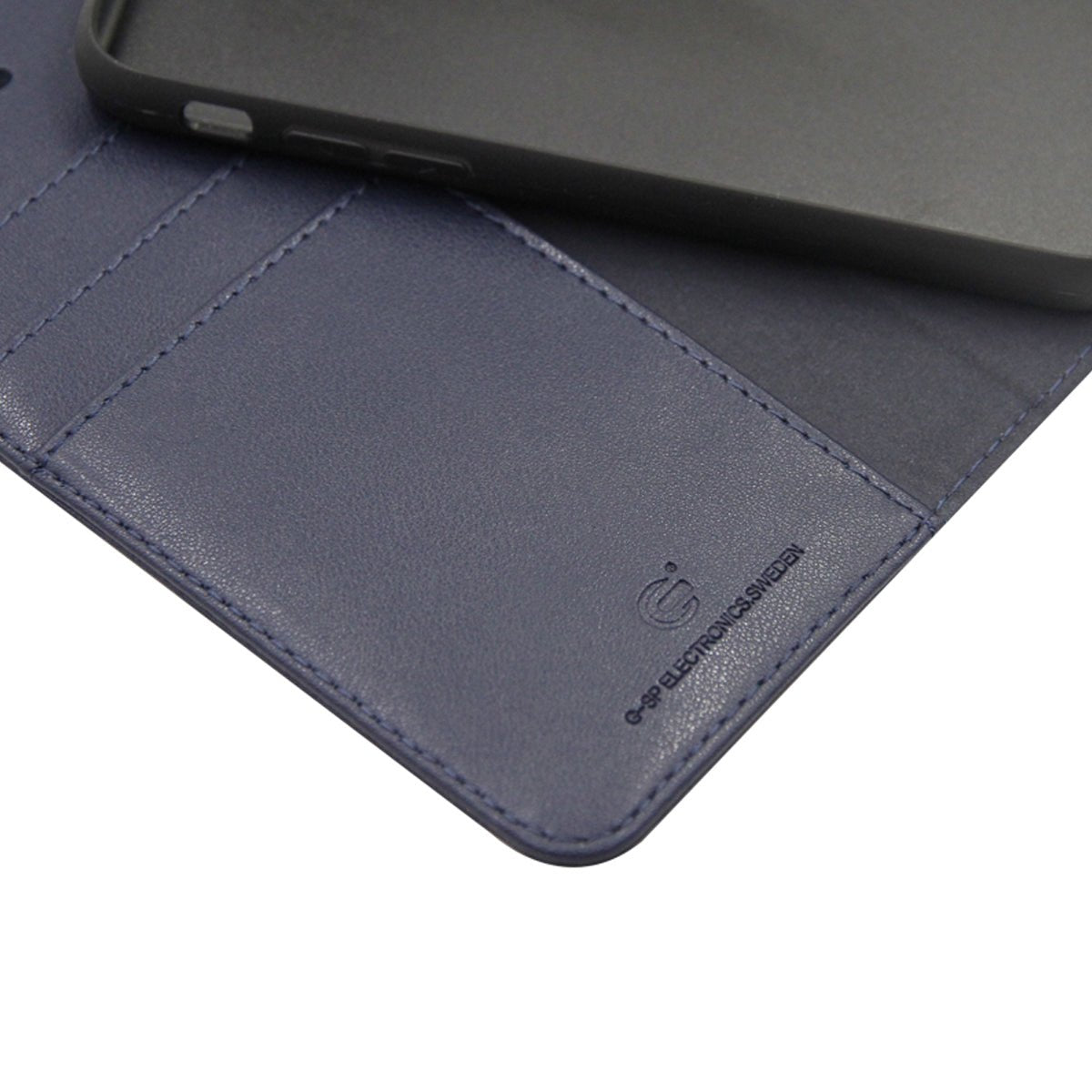 Fodralet är gjort i konstläder och stängs med magnet, vilket skyddar skärmen när locket är stängt. På insidan finns ett löstagbart skal som hålls på plats med magnet, så du kan ta ur telefonen från plånboksdelen vid behov.