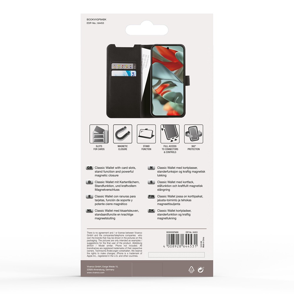 Vivanco Google Pixel 9a Fodral Classic Wallet Svart är ett svart mobilfodral till Google Pixel 9a.