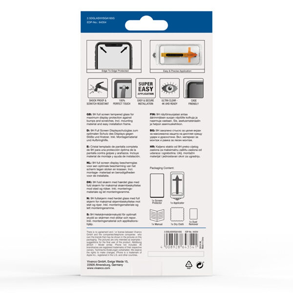 I förpackningen ingår monteringshjälpmedel, dammborttagare och mikrofiberduk för att underlätta rengöring och montering av displayskyddet.