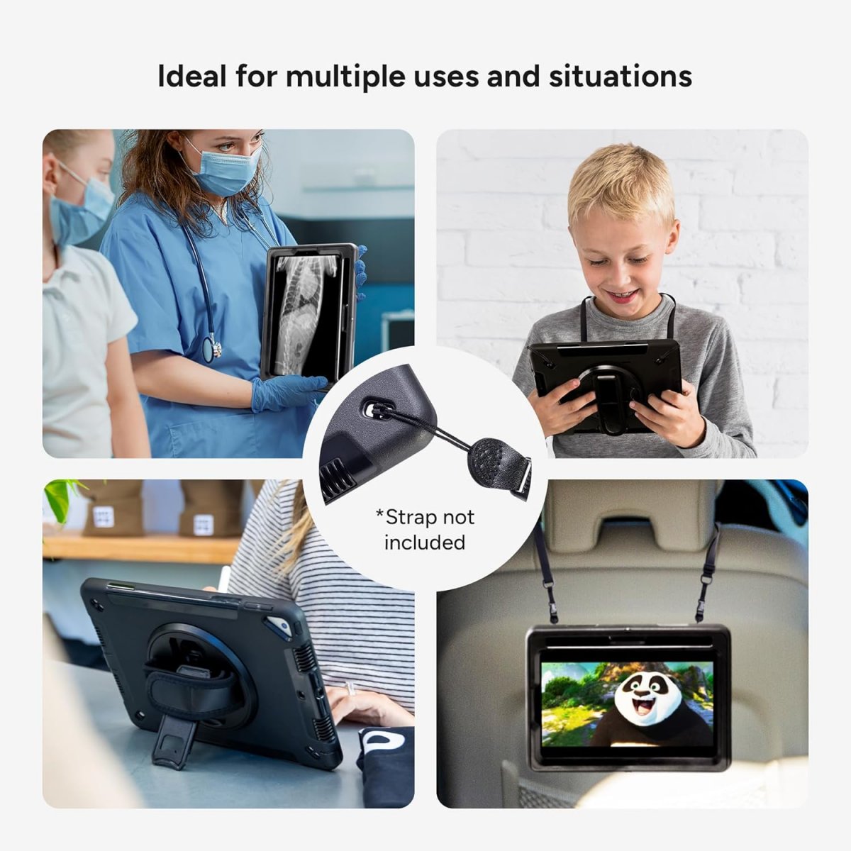 360 ROTERANDE HANDREM: Justerbar Velcro-rem ger ett säkert grepp, perfekt för enhandsanvändning vid presentationer och fältarbete. Kan roteras fritt för optimala betraktningsvinklar och enkel användning under längre perioder