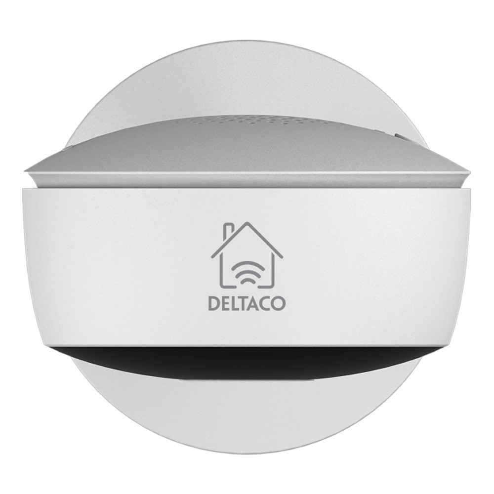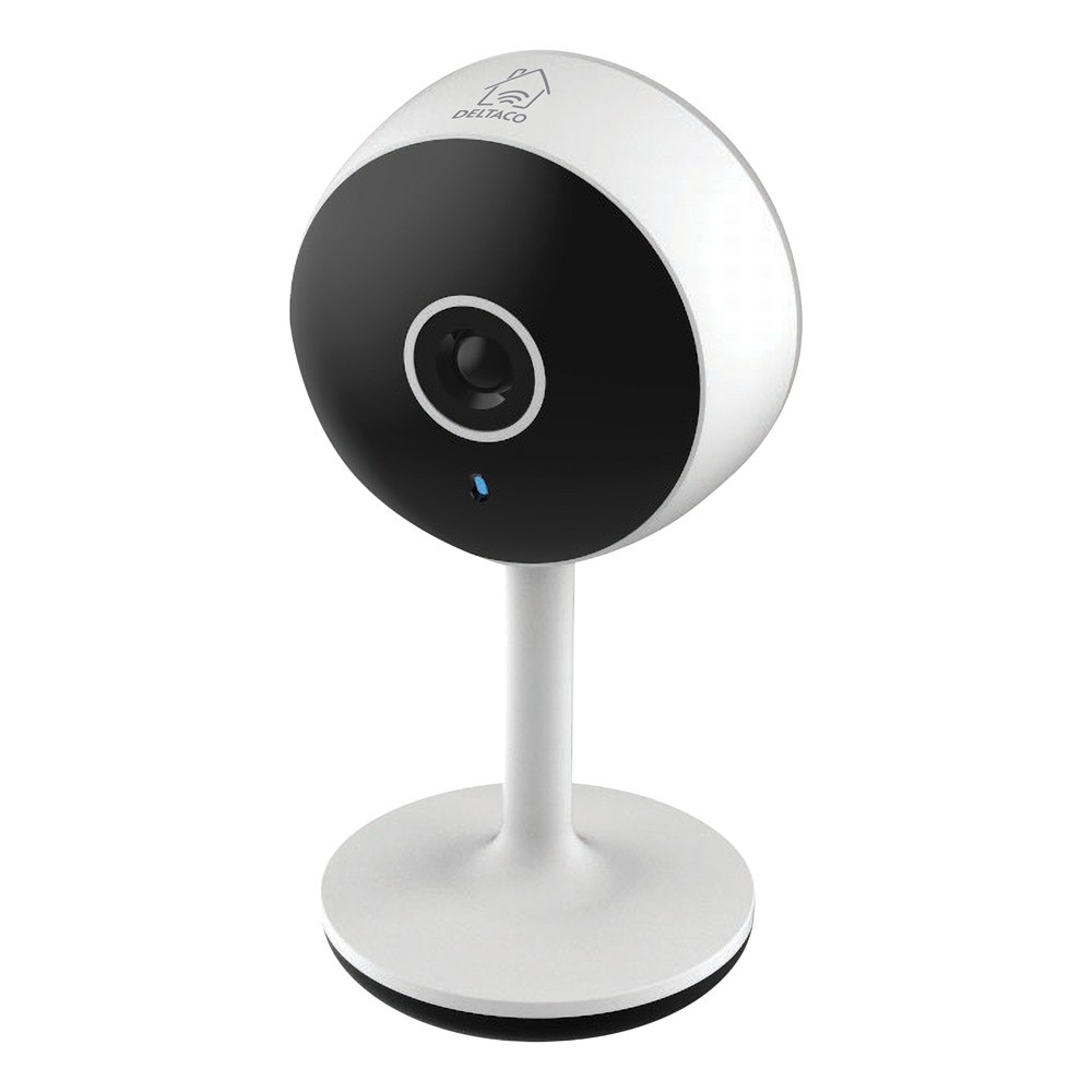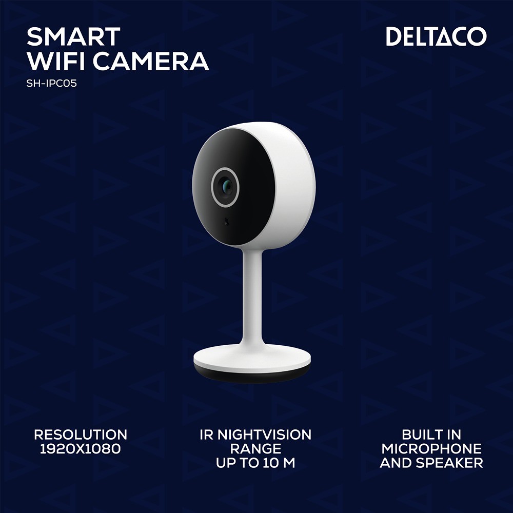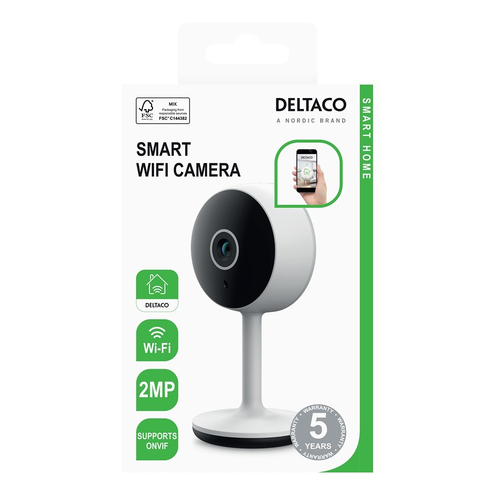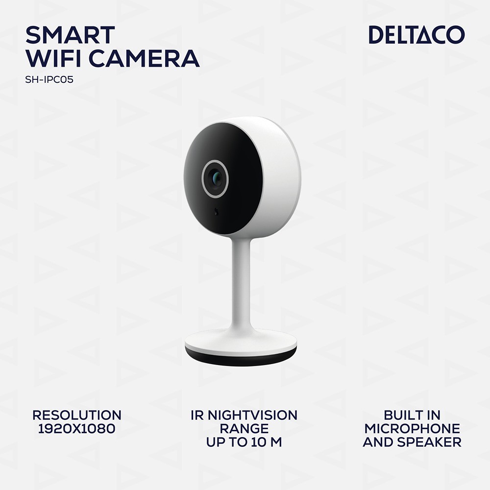 Smart WiFi-kamera med 1920x1080 (2MP) upplösning, IR-mörkerseende upp till 10 meter och rörelsedetektion med automatiska notifieringar. Kameran strömförs via USB-C och ansluts via 2,4 GHz Wi-Fi, den inkluderar högtalare och mikrofon för smidig tvåvägskommunikation via Deltaco Smart Home appen samt stödjer MicroSD kort upp till 128 GB.