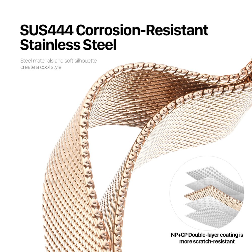 Klockbandet har en milanesisk mesh i rostfritt stål. Materialet är framtaget för att tåla långvarig användning och motstå korrosion, även vid fukt och svett.