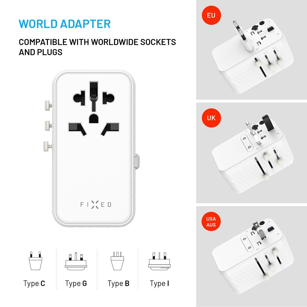 FIXED reseadapter är en universalladdare som du kan ansluta till olika uttag överallt i världen. Med hjälp av infällbara laddningsstift kan laddaren anpassas till EU, USA, länder med brittisk standard (Australien, Nya Zeeland och andra länder i samväldet) och de flesta andra uttag i världen. Dessutom är adaptern utrustad med en universell ingång till själva laddaren, som du till exempel kan använda när du använder en enhet med en utländsk laddningskontakt i nordiska uttag.