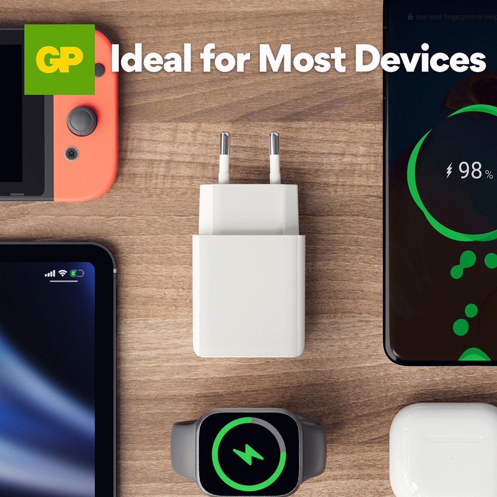GP 20 W PD-laddare laddar mer än tre gånger snabbare än standardladdare och kan ladda telefonen till 50% på endast 30 minuter. USB-C- och USB-A-portarna gör det möjligt att ladda två enheter samtidigt. De många säkerhetsfunktionerna förhindrar överspänning, överström och kortslutning.