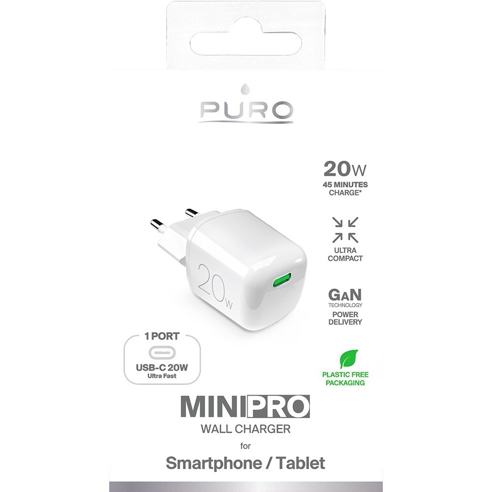 Kolla in Puros ultrakompakta, 20W MiniPro väggladdare med GaN-teknik, med en enda USB-C-port som ger kraft, säkerhet och hastighet. Tack vare GaN-tekniken levererar MiniPro mer kraft än konventionella laddare, vilket säkerställer snabb och pålitlig laddning för alla enheter. Denna innovativa teknik gör det möjligt att avsevärt minska storleken på väggladdaren, som faktiskt är ultrakompakt och mycket liten i storlek. Kort sagt, perfekt inte bara för användning hemma eller på kontoret, utan även under dina resor, eftersom det tar väldigt lite plats. Utrustad med en USB-C-port, idealisk för att ladda de flesta smartphones och enheter, laddaren har en 20W-utgång med Power Delivery-teknik. Faktum är att laddningen är mycket snabb, och slutför en smartphonecykel på bara 45 minuter och en surfplatta på bara 90 minuter. Revolutionerande laddning MiniPro 20W väggladdare från Puro erbjuder revolutionerande laddning: maximal effekt, maximal tidsbesparing, maximal platsbesparing. Så välj Puros väggladdare för att ladda din smartphone eller surfplatta, så märker du direkt skillnaden!