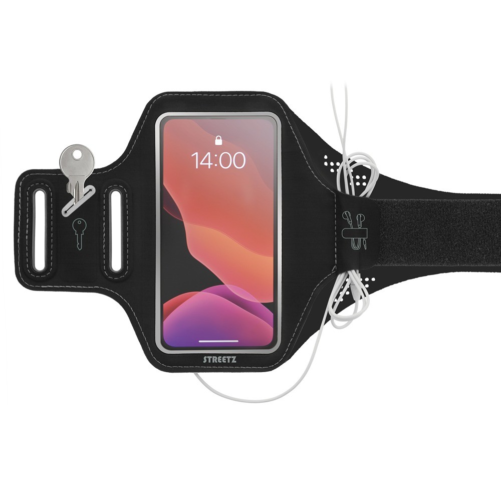 Ett hål för hörlurskabeln låter dig lyssna på musik medan du tränar och fodralet har även plats för en nyckel till skåpet i omklädningsrummet. Passar mobiler med skärmstorlek från 5,5" till 6,5".