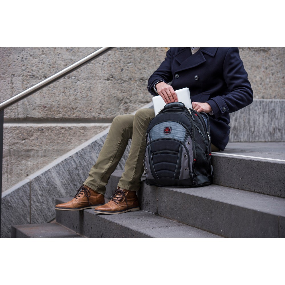 Möt Synergy, en ryggsäck med skyddande fack för din bärbara dator och surfplatta, samt en förvaringsficka för dina vardagsföremål. För snabb åtkomst finns en snabbåtkomlig ficka, och sidfickorna är tillräckligt stora för att rymma en vattenflaska eller ett paraply. Tack vare den stabiliserande basen står väskan stadigt, och de stötdämpande axelremmarna och kabelhandtaget garanterar komfort hela dagen.