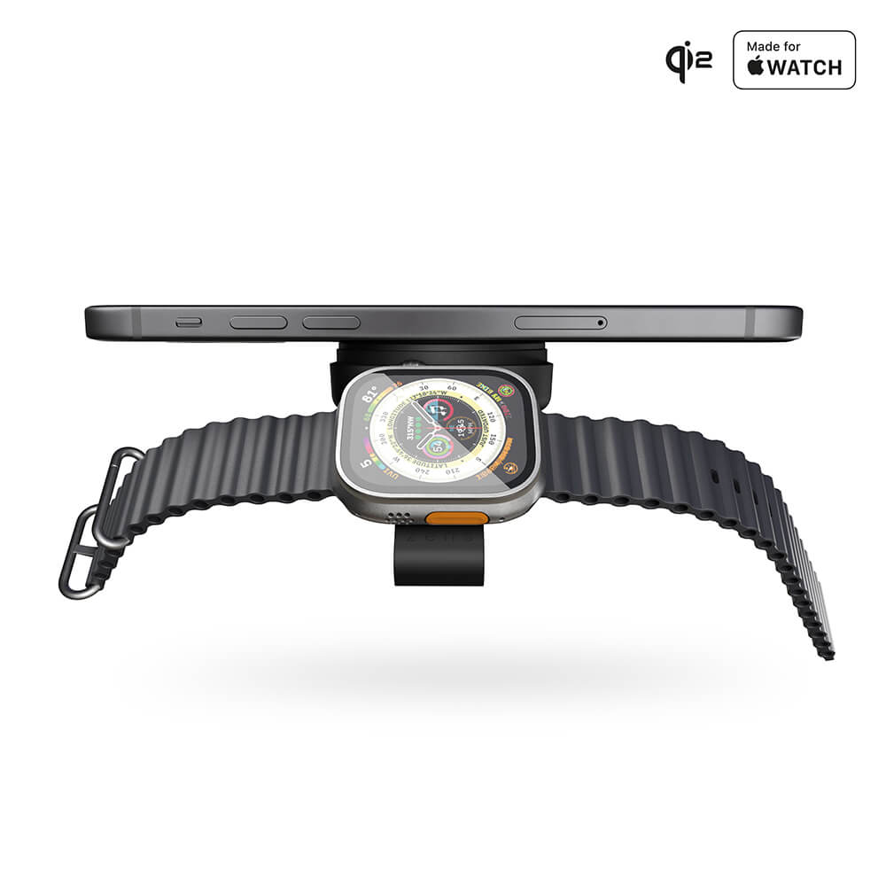 Travel Charger Pro 2 är en mångsidig och kompakt laddare. Framsidan av laddaren innehåller en Qi2-laddningsmodul, som kan ladda en Qi2- eller MagSafe-kompatibel telefon med upp till 15W. När stödet är öppet kan du ladda en Qi2- eller MagSafe-kompatibel telefon i horisontellt läge. På baksidan finns en Apple Watch-laddare som är fullt kompatibel med alla Apple Watch-serier upp till 5W.